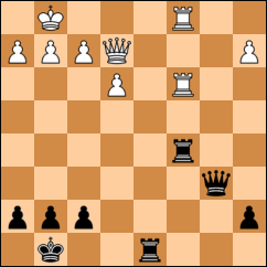 Czy aby napewno czarne zaczynają i wygrywają? Jeśli chodzi o czarne to zagrałbym 1. ... Kf7 ale wg mnie pozycja jest trochę lepsza białych. Natomiast jeśli zaczynają białe to wygrywają po : 1.Gb6 Gc7 2.Gc7 Hc7 ( 2. ... Wc7 3. We8 1-0 ) 3.Ha8 Wd8 4.We8 1-0